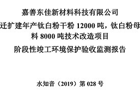 公?? 示??? 根據《國務院關于修改〈建設項目竣工環(huán)境保護管理條例〉的決定》(國務院令第682號),以及環(huán)保部《關于發(fā)布的公告》(國環(huán)規(guī)環(huán)評[2017]4號),現將嘉善東佳新材料科技有限公司遷擴建年產鈦白粉干粉12000噸,鈦白粉母料8000噸技術改造項目階段性竣工環(huán)境保護